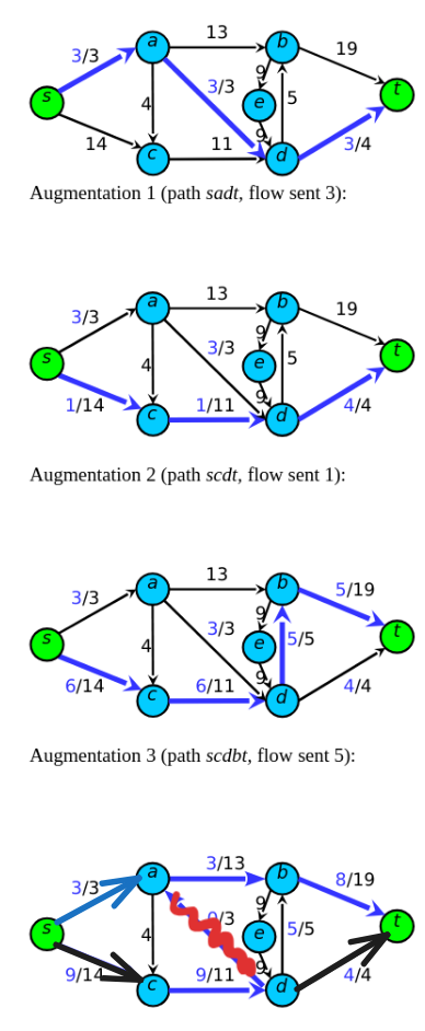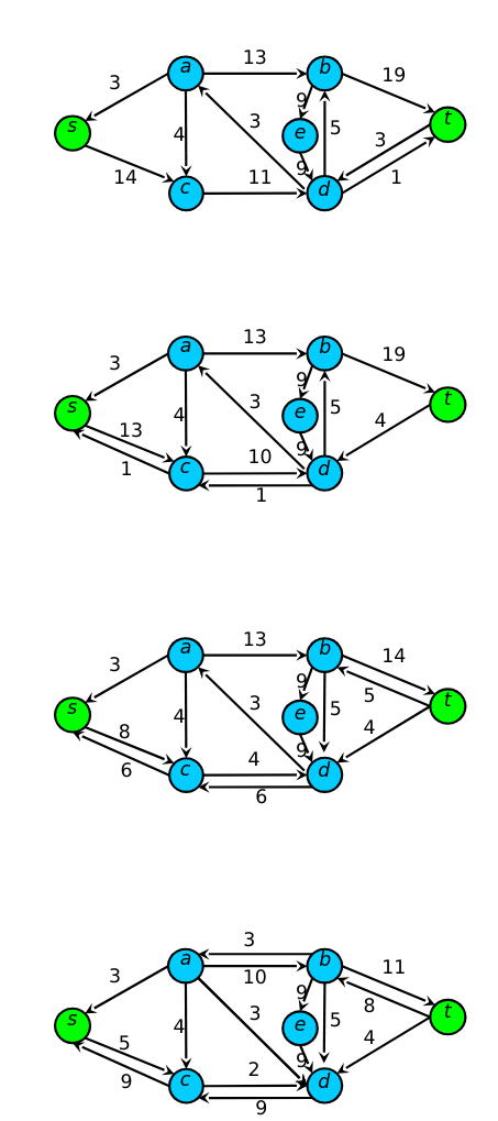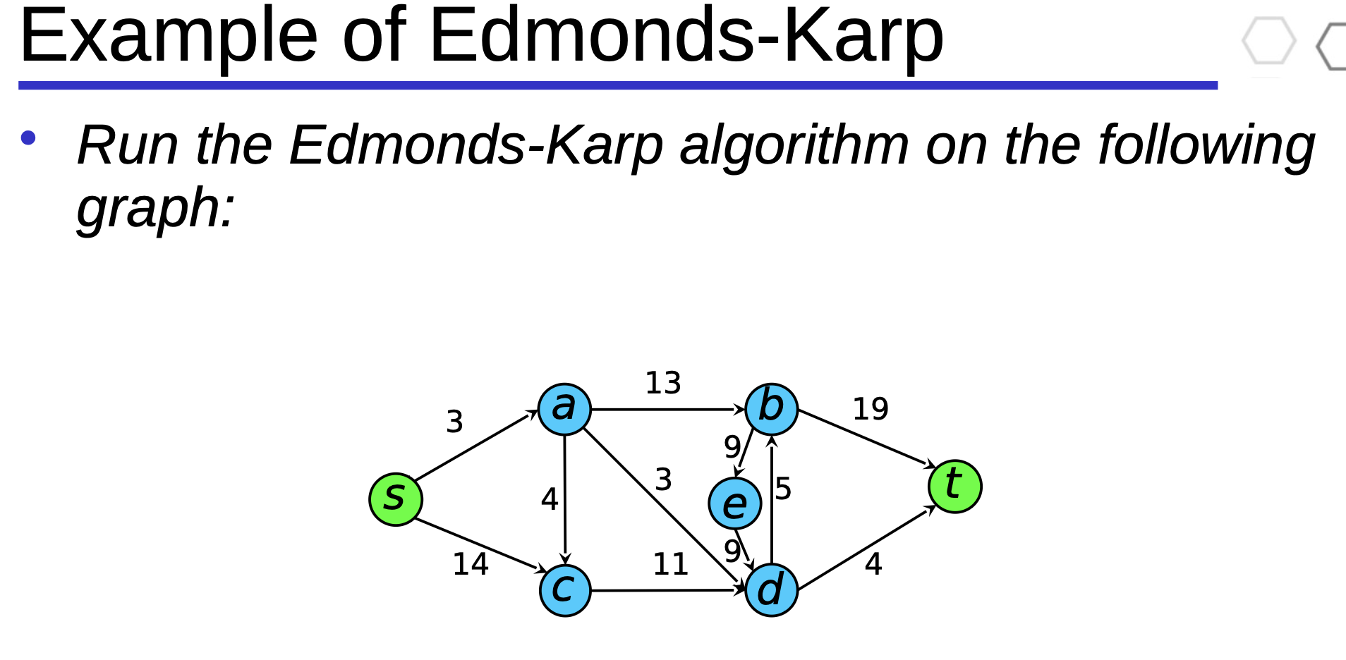 - Run the Edmonds-Karp algorithm on the example on slide 21. Start with the augmenting path sadt. Show each augmenting path used and the corresponding residual network. How many augmenting paths do you use? What are their lengths? Does flow cancellation happen in the example? If yes, when?