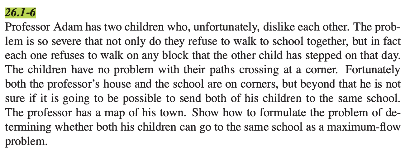 - Solve CLRS4 24.1-6 (CLRS3 26.1-6) (Requires some creativity, but try to see what ideas you can generate. The hardest problem is to prevent both children from going through the same street in opposite directions. This can be solved by transforming each edge of the flow network into something that has more edges…)