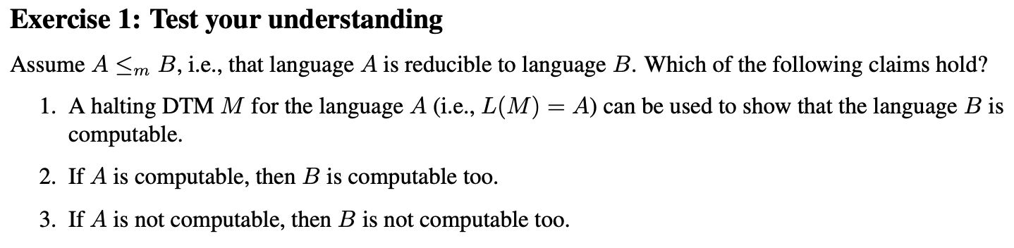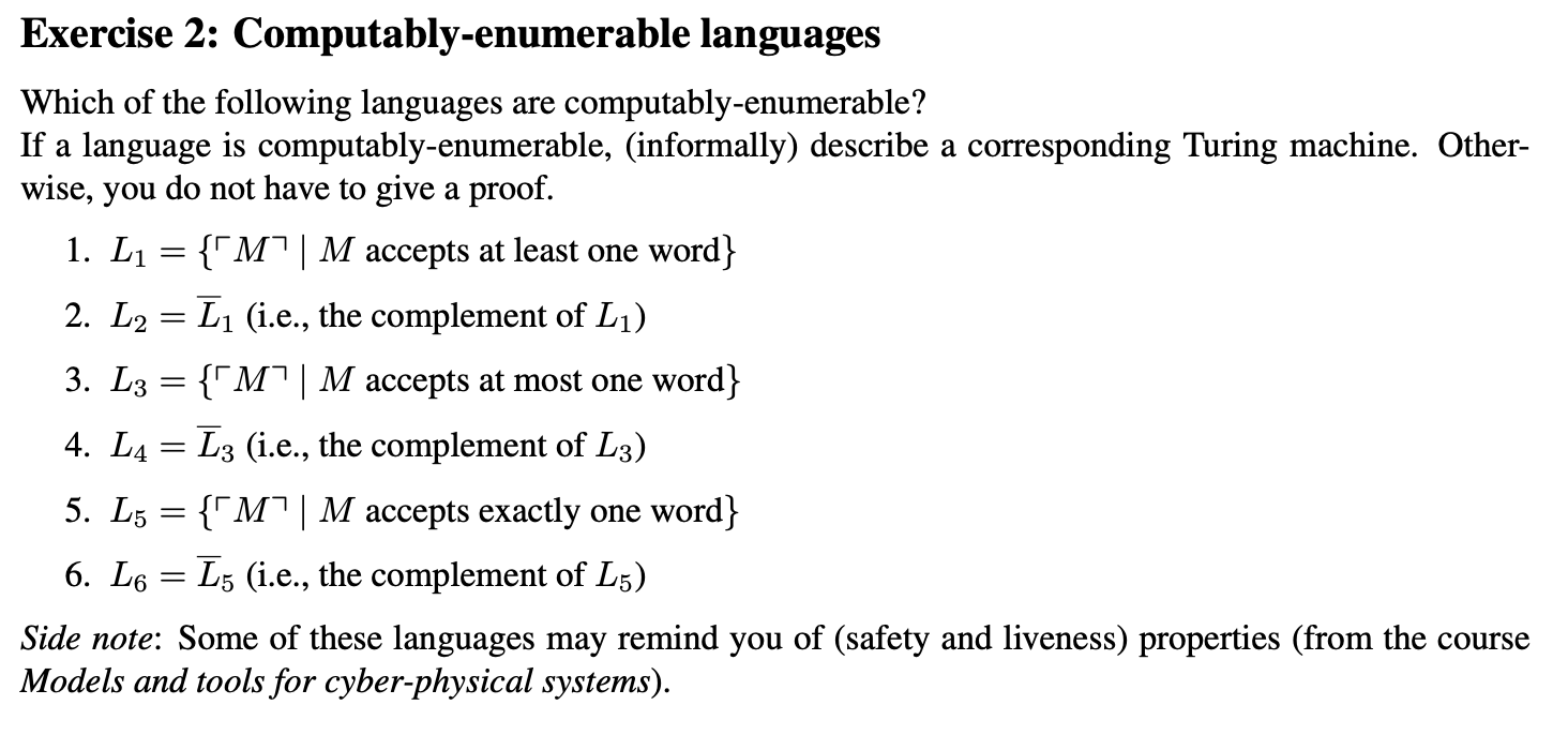 L3, but L3 is not computably-enumerable. But such an argument is generally flawed (why?). Argument: We cannot come up with an enumeration algorithm, since we would not know when to accept. We can search for the first word that is accepted, but then there may always exist another word that is also accepted; hence, we can never terminate the search.