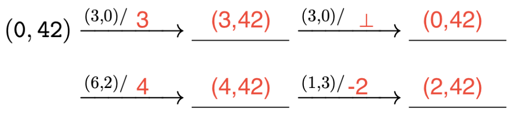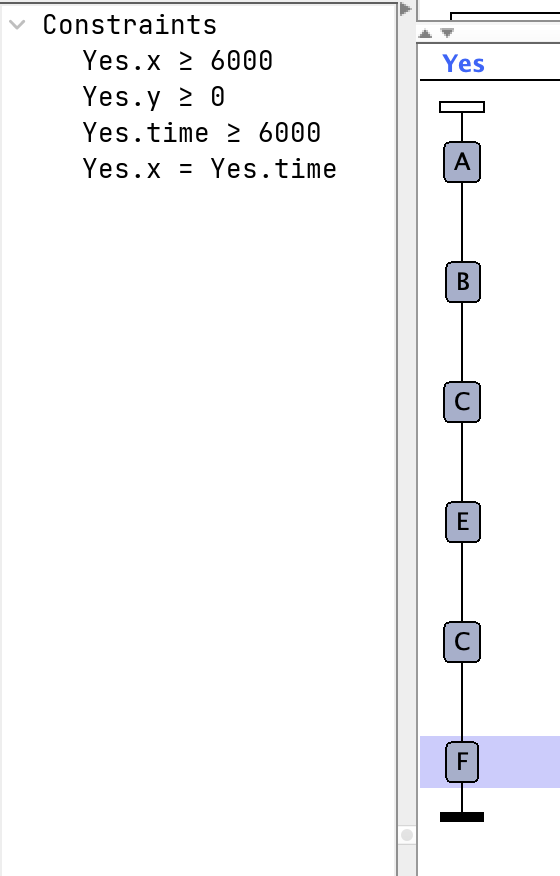 For F: (A, x = 1, y = 1) ⇒ (B, x = 4, y = 1) ⇒ (C, x = 4, y = 1) ⇒ (E, x = 4, y = 1) ⇒ (C, x = 6000, y = 0) ⇒ (F, x = 6000, y = 0)