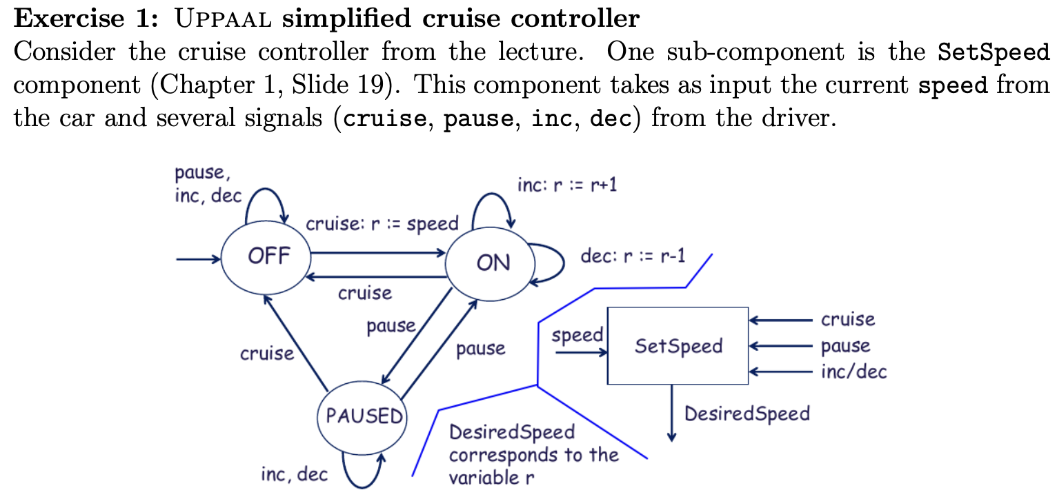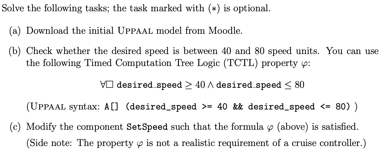 a) Done b) so we set our queary(s) to this to check if it ever goes over or under the values set here. A[] desired_speed >= 40 A[] desired_speed ⇐ 80 and it does not pass