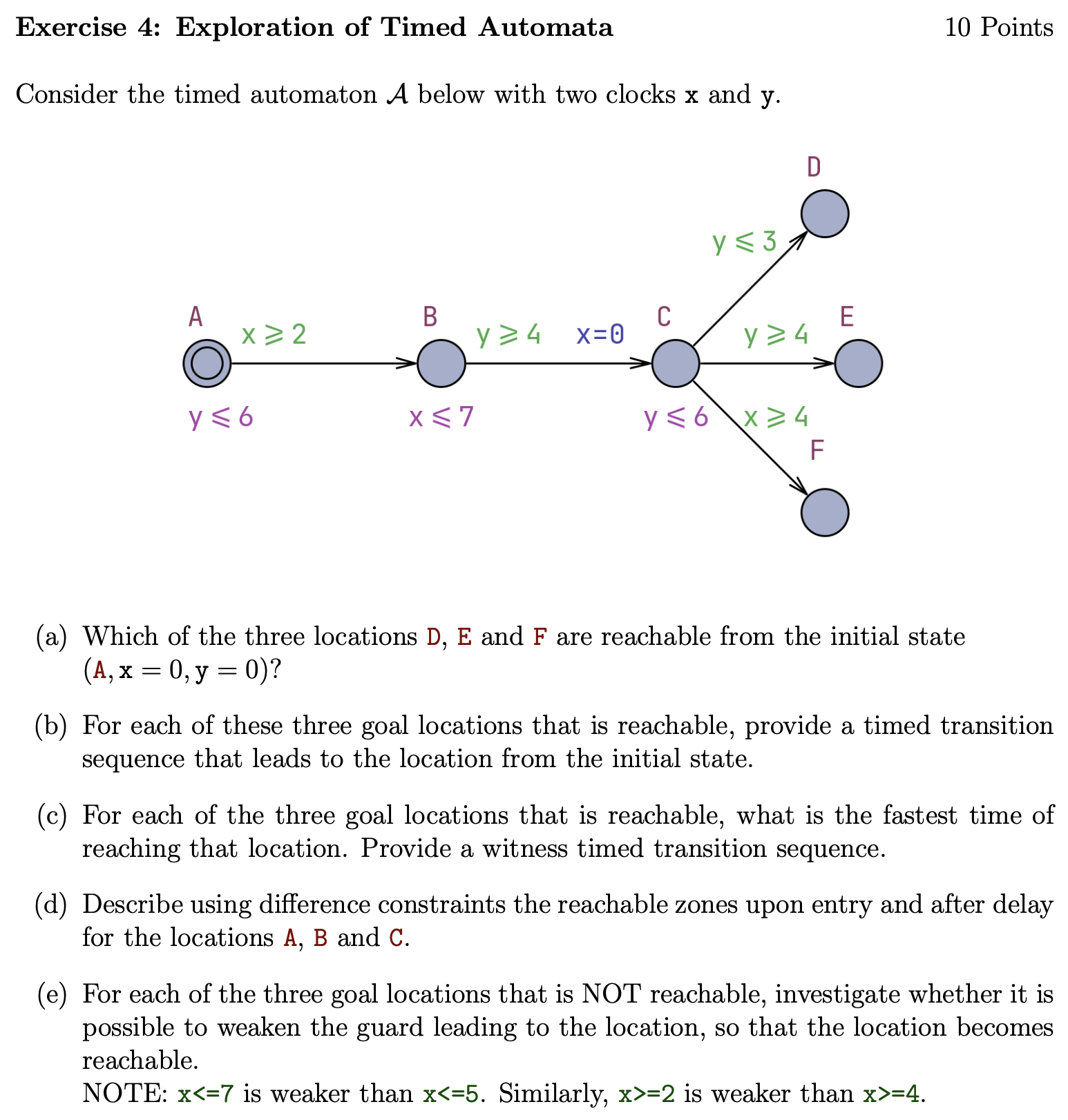 a) Only E is reachable because in D y needs to be 3 but it is at least 4, and in F for x to reach 4 y would need to be 8, but the invariant says we need to leave on or before y reaches 6.