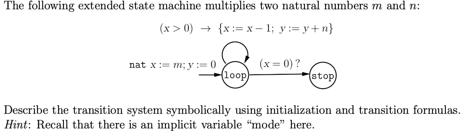 (mode = Loop ∧ x > 0 ∧ x’ = x - 1 ∧ y’ = y + n ∧ mode’ = loop) ∨ (mode = Loop ∧ x = 0 ∧ x’ = x ∧ y’ = y ∧ mode’ = stop)