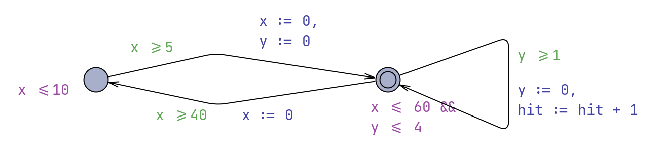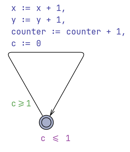 c >= 1:x := x + 1,y := y + 1,counter := counter + 1- Reset: