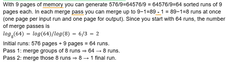 - = Number of runs you can merge in one pass (because 1 page is reserved for output).